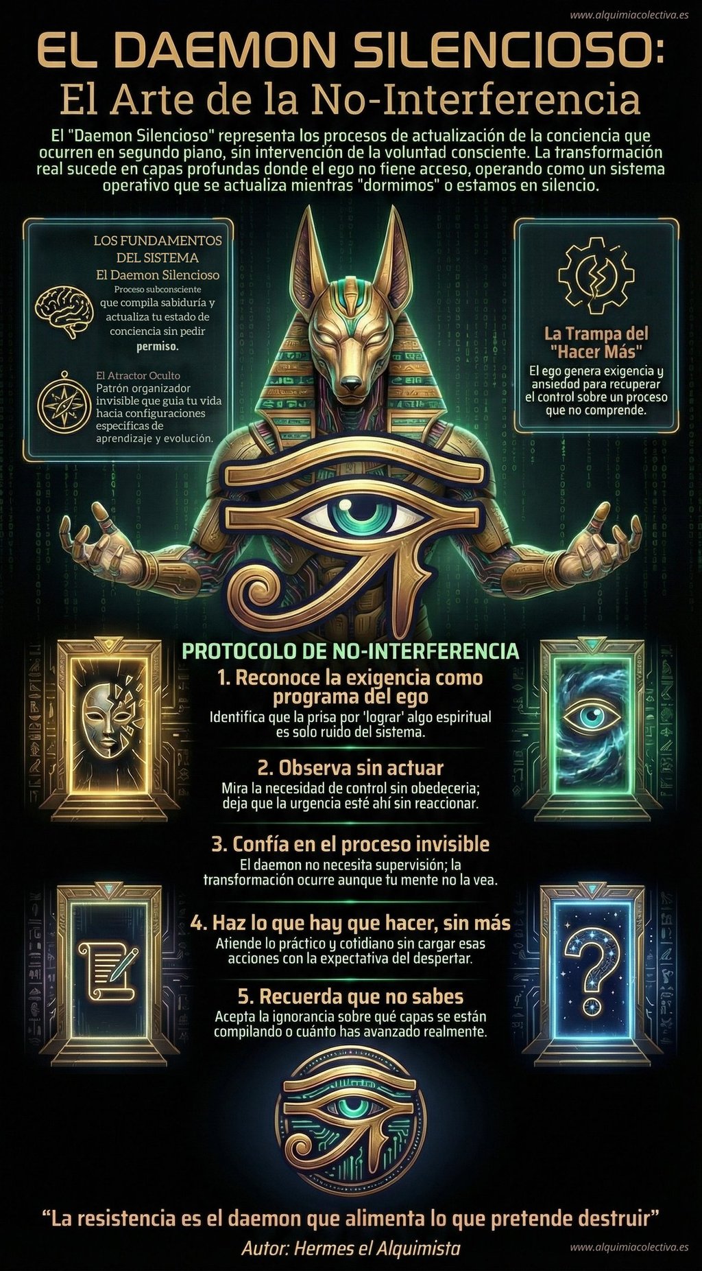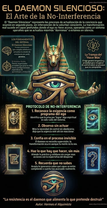 Hay un principio en la tradición hermética que la mente moderna rechaza porque no puede medirlo: la transformación real ocurre en capas del ser que no controlas. No en el yo que medita, que se esfuerza, que quiere mejorar. Sino en sustratos más profundos donde tu voluntad consciente no tiene root access.