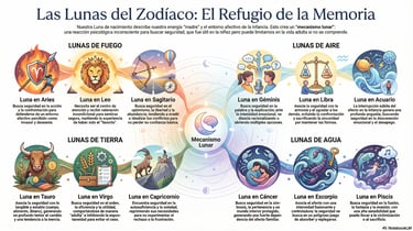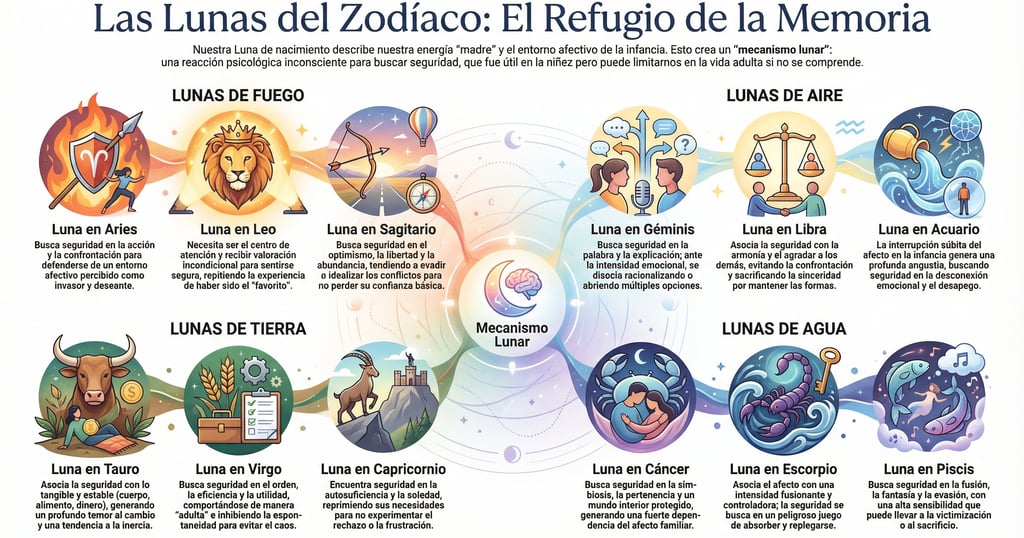 La Luna en astrología representa algo más íntimo que la personalidad: es el refugio emocional, el lugar donde buscamos seguridad cuando el mundo amenaza con desbordarnos. Cada signo lunar construye su propio santuario, pero los signos que comparten un mismo elemento comparten también una forma esencial de protegerse.