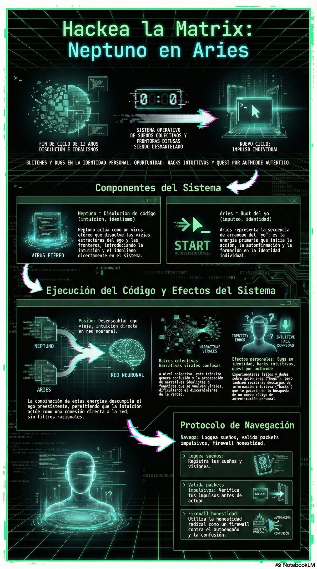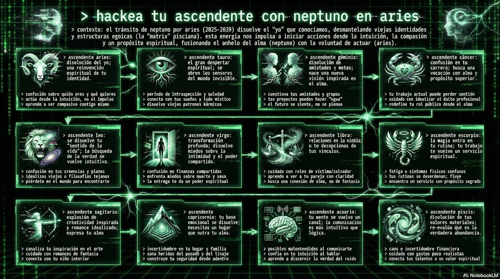 En lo personal, Neptuno en Aries es la nigredo —la fase negra de la alquimia, la putrefacción necesaria. El guerrero interno levanta la espada y descubre que el enemigo no tiene forma. Es como debuggear un error que no reproduce: tu voluntad no encuentra superficie de impacto.